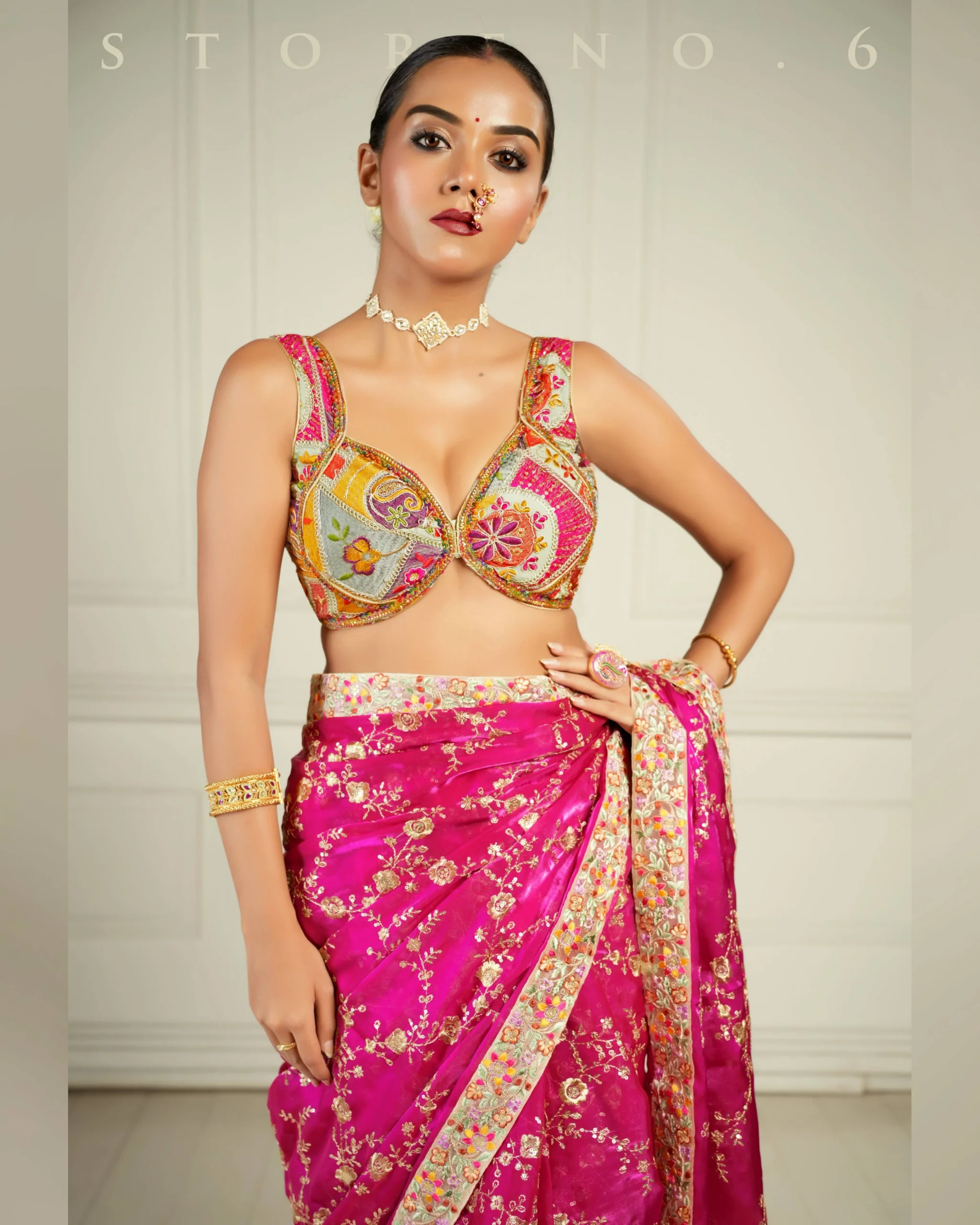 Mint Green Georgette Blouse with Multicoloured Thread and Sequins Embroidery Works. Sleeveless Blouse With Spread V-Shaped Back