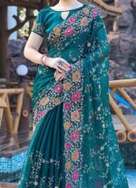Floral Thread Embroidered Sequins Stone Embossed Saree is a luxurious blend of timeless elegance and contemporary style designed to make a statement at any festive or special occasion. This saree is meticulously crafted from premium fabric showcasing a rich Teal hue that exudes vibrancy and celebration. The intricate floral thread embroidery along the border adds a touch of traditional artistry while the sequins and stone embossing bring in a modern dazzling effect that catches the light with every movement ensuring you stand out in a crowd.