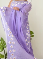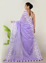 - It is paired with a white cotton blouse that provides a neutral yet polished contrast to the lavender saree. The blouse seen in the image follows a tailored cut that complements the simplicity of the saree. The pairing not only makes the overall outfit harmonious but also allows the hand painted detailing on the saree to take visual precedence. This makes it a versatile combination that can be styled in various ways depending on the setting. The classic neckline and sleeve structure add refinement to the look while allowing ample room for comfort and movement.