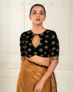 - Black Velvet Embroidered Blouse Embellished With Golden Zari And Sequins Work,Adding Black And Golden Border And Beads.