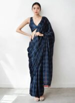 • The matching blouse is crafted in the same navy blue chinon fabric and features the same digital check pattern. It is tailored with a V neckline in both the front and back as shown in the image. The blouse is designed with a low front and very low back cut to reflect a confident and sleek profile. The sleeveless design and natural waist fit maintain the contemporary aesthetic.