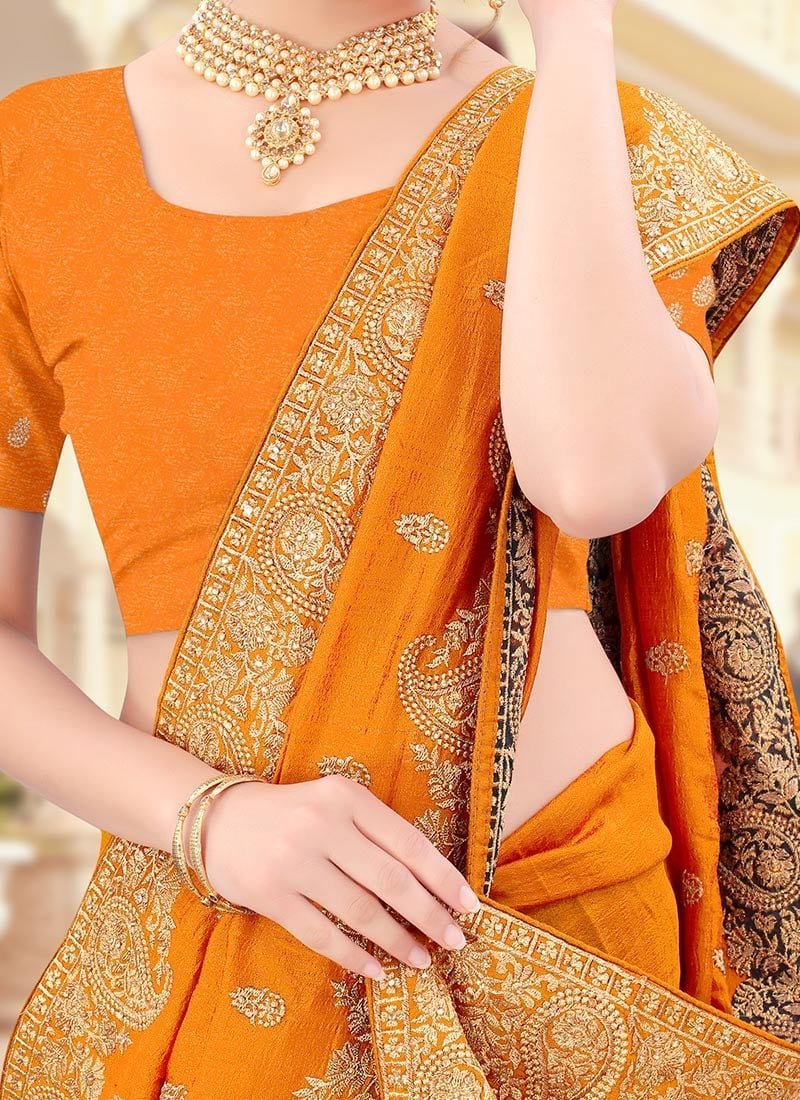 Orange Vichitra Silk Zari Embroidery Saree Party Wear