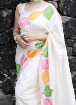 This saree is an exquisite example of traditional craftsmanship and contemporary elegance. Crafted from pure white silk this saree showcases a striking contrast with its intricate woven green and pink mustard leaf design. The body of the saree is kept plain in a pristine white providing a perfect canvas for the vibrant foliageinspired motifs that adorn the pallu and borders. The highlight of this ensemble is the meticulously woven green mustard and pink stripes that run along the edges of the saree adding a dynamic and captivating element to the overall look. These colorful stripes beautifully complement the intricate mustard leaf patterns creating a harmonious blend of colors and textures. The saree is paired with a matching white blouse featuring a stylish vneckline and sleeveless design enhancing the modern appeal of the traditional attire. The simplicity of the blouse ensures that all attention remains on the stunning saree allowing its detailed craftsmanship and vibrant hues to shine. This ensemble is perfect for special occasions such as weddings festivals or formal gatherings where you want to make a statement with your attire. The combination of classic silk fabric intricate woven details and contemporary design elements makes this saree a timeless and versatile addition to any wardrobe. Embrace the beauty of Indian craftsmanship and heritage with this beautifully crafted saree that seamlessly blends tradition with modern aesthetics.