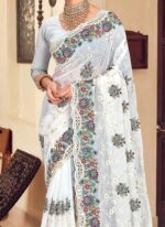 An remarkable white georgette saree will make you appear highly stylish and graceful. This lovely attire is looking beautiful resham embroidered n sequins work over the saree. This saree comes with an unstitched white georgette blouse. This saree is perfectly suited for party wear.